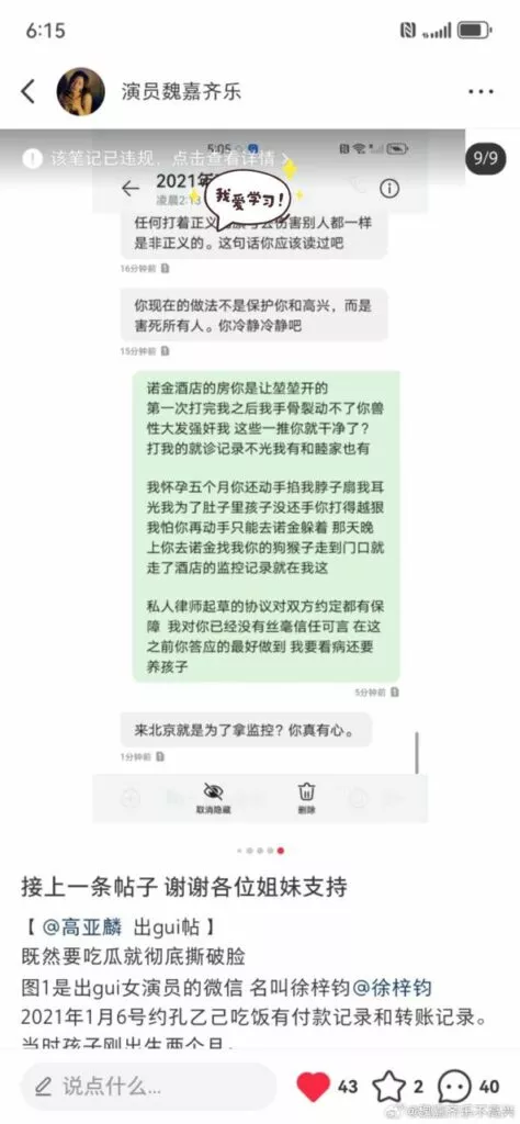 演员魏嘉发文爆料称演员高亚麟孕期出轨家暴
