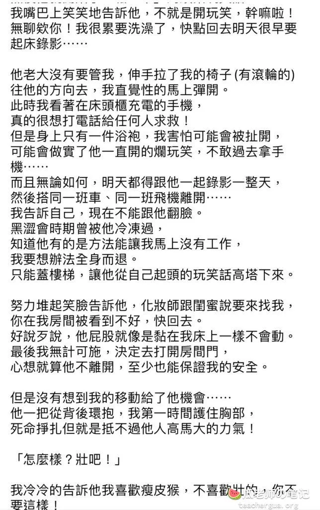 性搔扰问题本身很难取证和维权,因为受害者常常害怕和恐惧,很少想到留下证据。大牙也在她的文章中指出了这一点。这也意味着一些性搔扰犯可能会多次犯罪,他们似乎对如何应对有备而来。大牙在当时还是陈建州公司的艺人,她事后只能选择忍气吞声。直到多年后,她才有勇气站出来揭发。