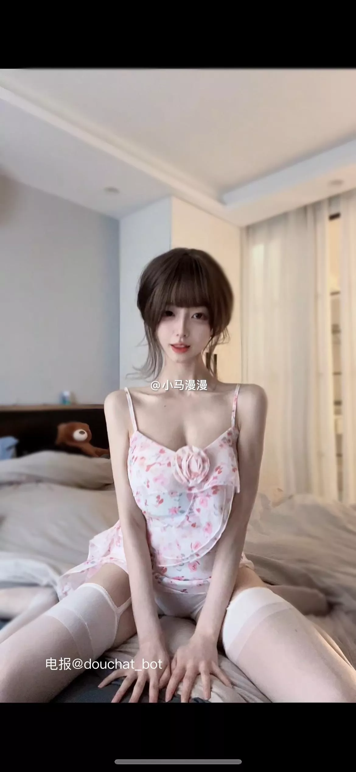 小马漫漫画期特别呈现温柔甜美的梦中女神!身着粉色碎花吊带裙搭配纯白吊带袜的小马漫主播,展现出清纯与性感并存的迷人魅力。坐在柔软床铺上,微侧身,勾勒曼妙曲线,她那温柔而勾魂的眼神,让人沉醉其中。