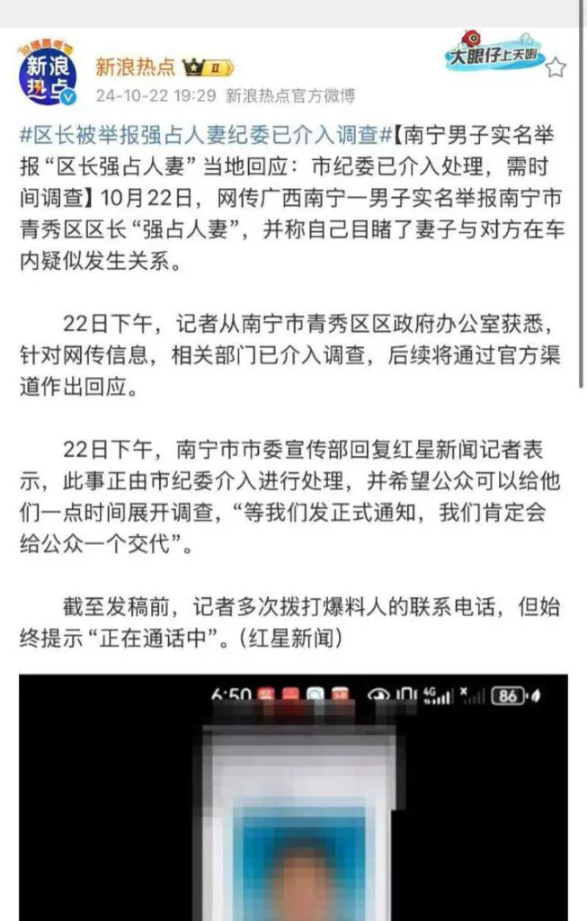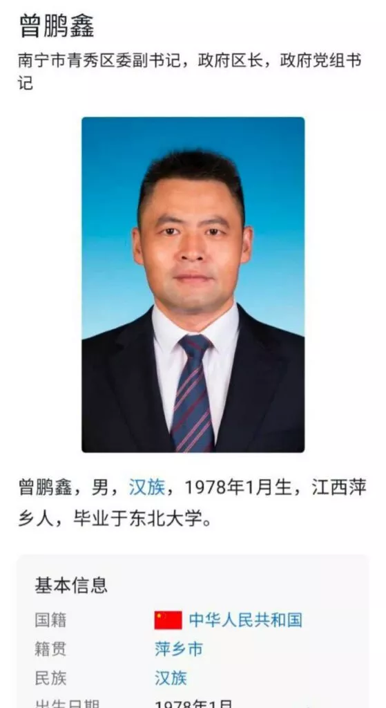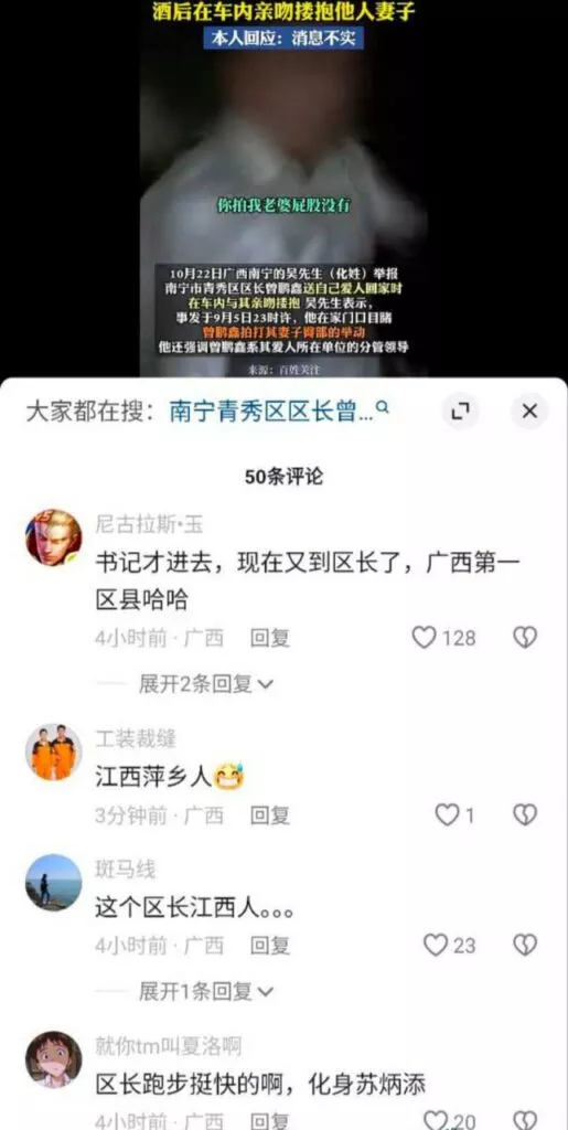南宁青秀区区长曾鹏鑫被指控强行拥抱他人的妻子。该女性的丈夫目睹了区长拍打其妻子的臀部,而她则表示自己无法反抗区长的亲吻和拥抱。这使得她的丈夫前去找曾鹏鑫进行质问。