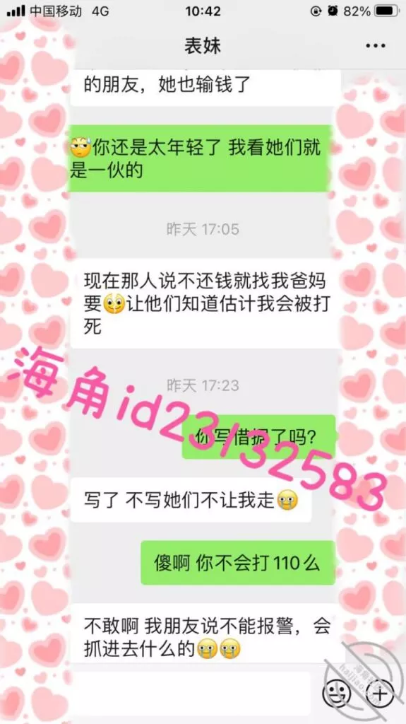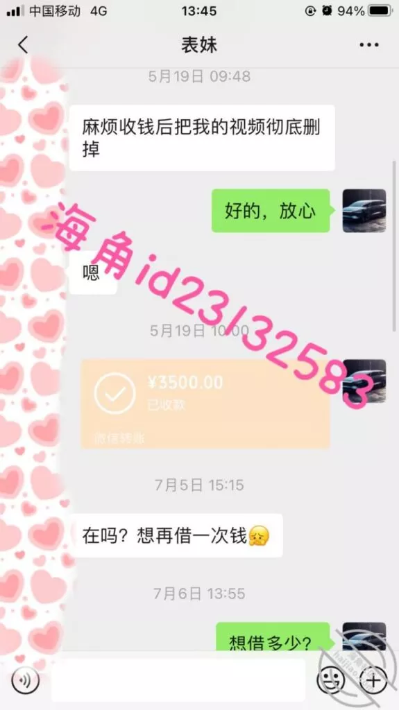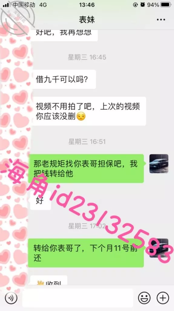 这次我故意说要一个月还,让她短时间内很难再找其他人借,视频不强求她拍了,用我大号表哥的身份作担保来转钱给她,不然她容易怀疑,两次都是不直接转给她…