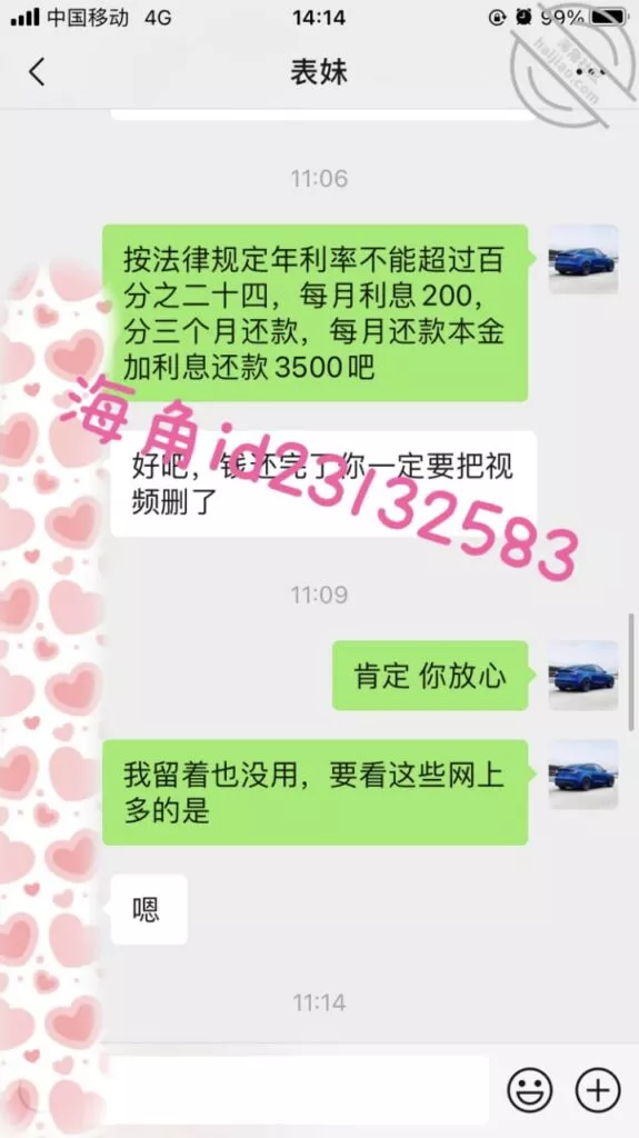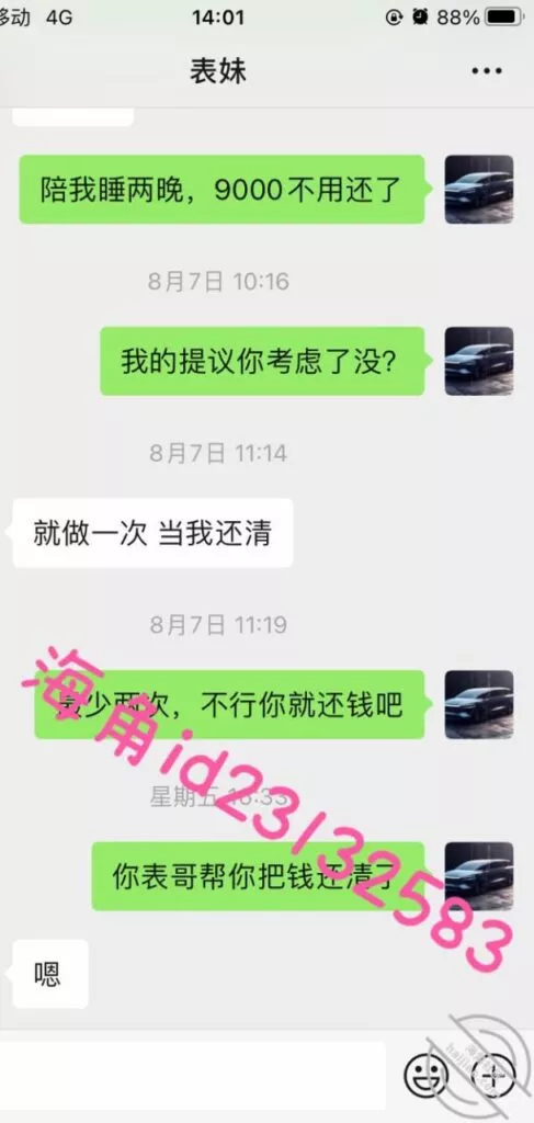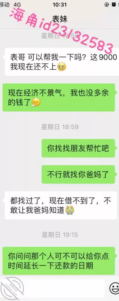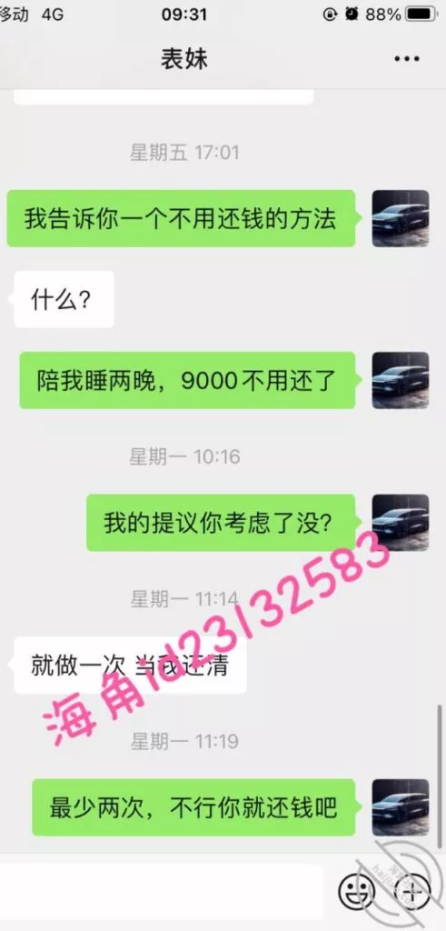 上周五用小号提醒表妹准时还款,果然她要还不上了,先吓一下她要发视频给家人,然后说9000陪我睡两晚,她就不理我了。