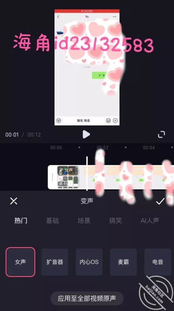 一直在想用什么方法让表妹不会有怀疑我小号就是我的想法,如果能有兄弟帮忙肯定最好,可惜这不能让第三人知道,最后我决定先用微信发个语音到小号,录屏下来后用剪辑软件的变声器处理一下,让她听不出是我的声音。