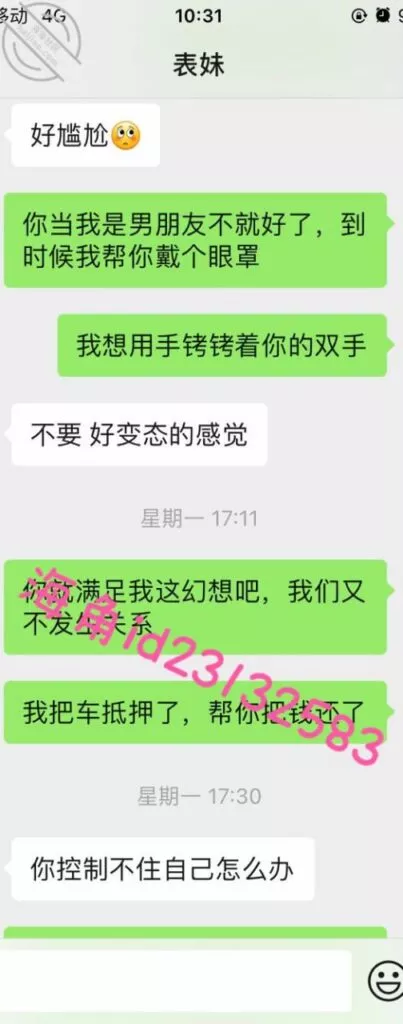 星期一我小号再问她她说做一次就当还9000,我坚持最少要两次,这样表哥的身份才好说话,下午我用大号再关心一下表妹,让她帮我口出来,但是附加了戴眼罩和用手铐的条件,这样可以省很多麻烦,你们懂的。