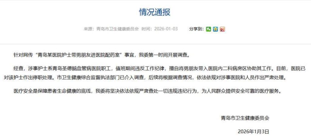 青岛圣德脑血管病医院一名女护士在视频中炫耀男友夜陪。画面显示一名手臂多处纹身、着便服的男子在护士站搬运物资、为护士按摩、代写报告,甚至参与配药、为静脉输液瓶贴标签。将私人感情带入工作并进行非专业Cao作,既违职业纪律,也可能引发医疗安全与感染控制隐患,十分不妥。