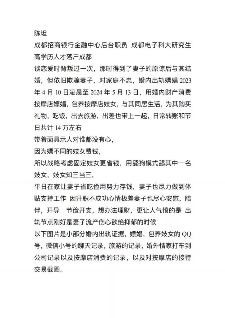 成都招商银行武侯区支行的员工陈坦,婚前出轨被老婆原谅,婚后在老婆流产时继续出轨嫖娼,还包养了一个小姐,为其花费14w,老婆发现后曝光全网。