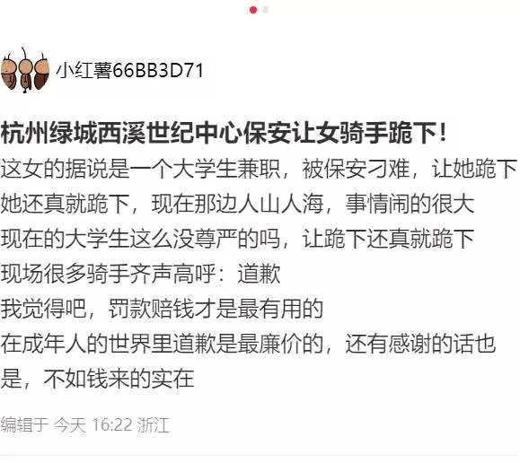 在杭州绿城西溪世界中心,一名普通的保安对一名外卖骑手百般刁难。这位外卖骑手是一名在大学放假期间兼职的女骑手,她被保安要求跪下道歉,甚至在罚款200元后,保安还将她的车钥匙拔走,并侮辱地称外卖骑手为“狗”。这一事件引发了杭州市超过一半的外卖骑手前来现场声讨这名保安。