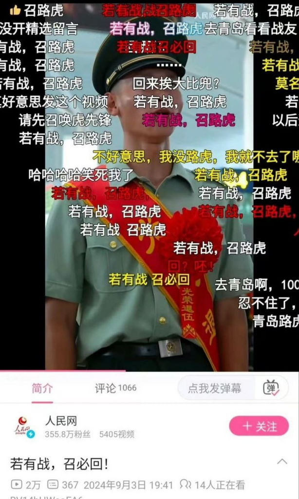 这是人民网发布的一段视频,但是目前视频已经被消失。视频弹幕中讽刺性地将“召路虎”与“战时应召”联系起来,表明公众对路虎女司机的暴力行为和无视法律的态度感到愤慨。