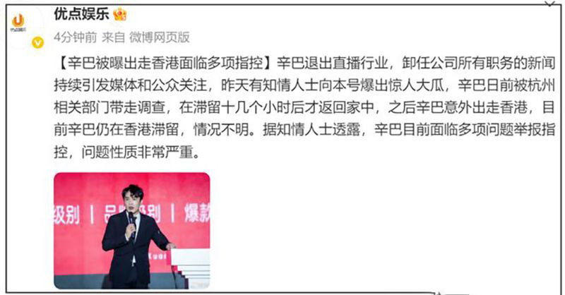 据报道,快手平台上拥有亿万粉丝的顶级带货主播辛巴,五年内已六度宣布退网。自所谓的“堕胎卫生间事件”曝光后,有消息称他疑似出海躲避风波,另有传闻称其在杭州因涉嫖娼被警方传讯调查。