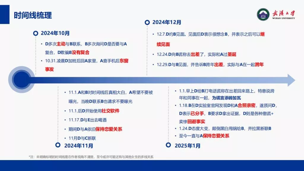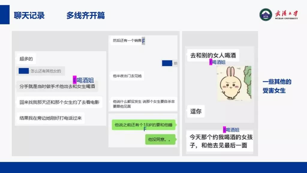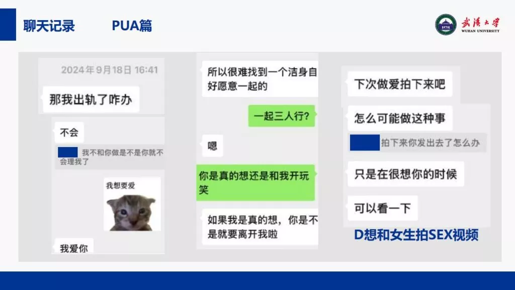 24页PPT揭露了武汉大学特聘副研究员的不当行为。他的师德败坏,令人失望,真可谓人渣中的人渣。同时,他与多名女生交往,向每位女生声称是真爱,简直可以称为顶级时间管理大师。他的一些经典言论更是毫无道德可言,彻底破坏了师德。他甚至扬言要“c满50个”。