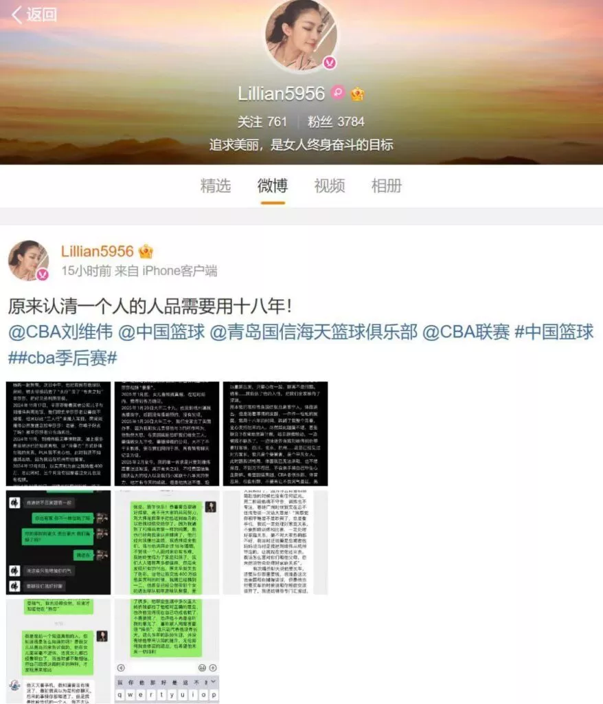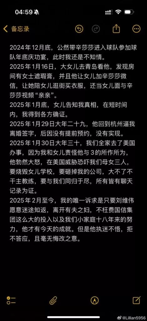 cba青岛国信男篮主教练刘维伟被妻子发文举报婚内出轨有夫之妇